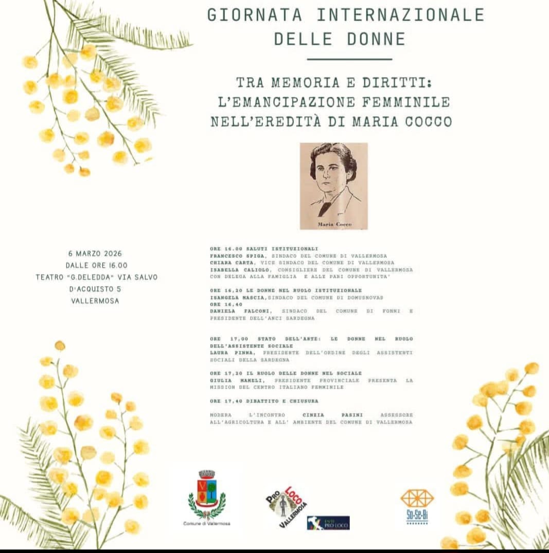 - Venerdì 6 marzo 2026: incontro culturale Presso Il Teatro “G. Deledda” Via Salvo D’Acquisto N. 5 – Vallermosa Ore 16:00: