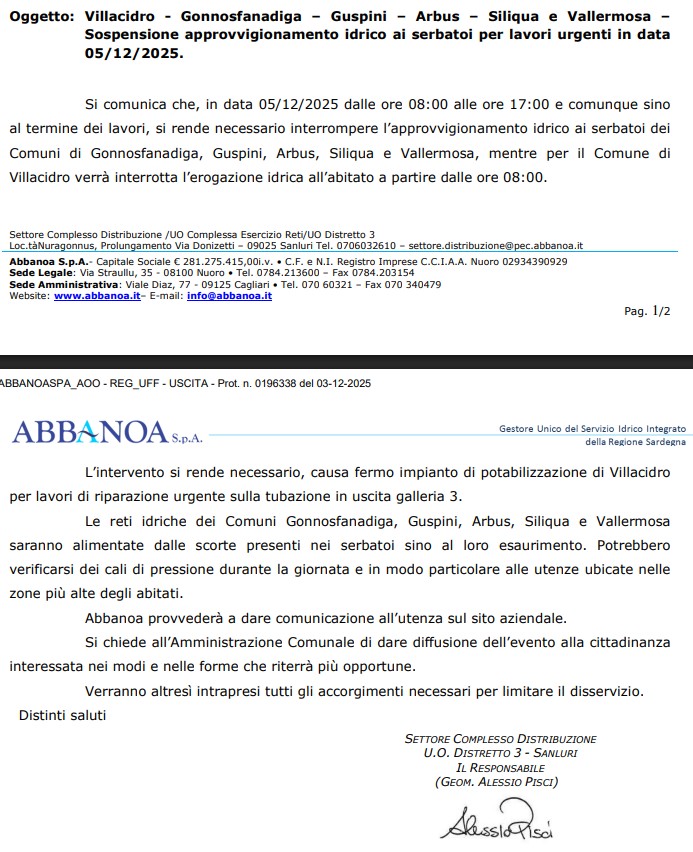 Si comunica che, in data 05/12/2025 dalle ore 08:00 alle ore 17:00 e comunque sino al termine dei lavori, si rende necessario interrompere l’approvvigionamento idrico ai serbatoi dei Comuni di Gonnosfanadiga, Guspini, Arbus, Siliqua e Vallermosa, mentre per il Comune di Villacidro verrà interrotta l’erogazione idrica all’abitato a partire dalle ore 08:00.